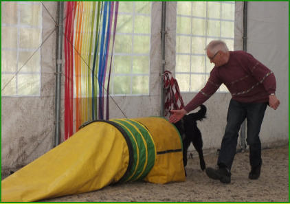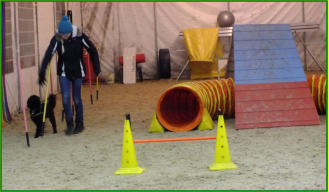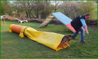 Unser Kursmodell für erwachsene Hunde (ab ca. 15 Monate): Es geht los mit Tunnel und Sacktunnel, verschiedene Hürden